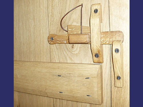 Wooden latch fitted to an internal plank door, the door being assembled with clenched hand stamped rosehead nails.