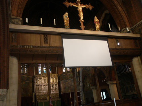 This shows an Oak housing fitted to the rood screen of a Victorian Church, from which a remotely operated screen is lowered during the service. The internal workings of the very rare and recently restored organ are then projected onto the screen to help the congregation concentrate on the service!